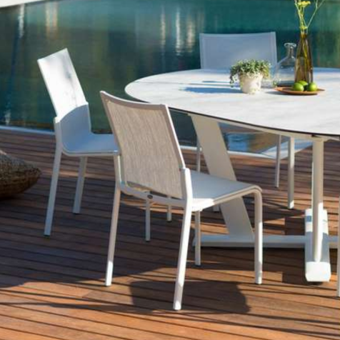 Les Jardins Hegoa/Koton patio furniture for sale: Les Jardins Hegoa Extendable Table in White aluminium,full white polish concrete HPL top and 8 Les Jardins Koton Stackable Chairs in with aluminium frame and Batyline Eden fabric.